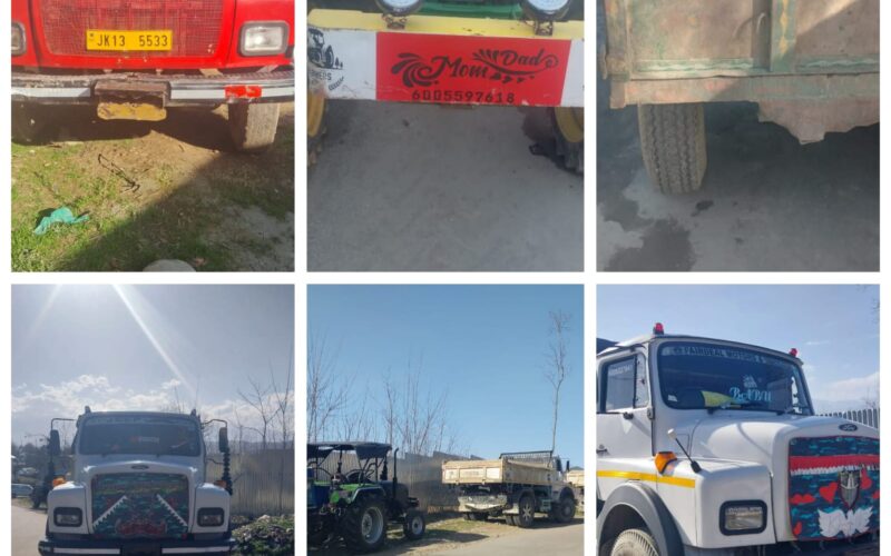 Handwara, March 15: In a significant crackdown on illegal mineral extraction and transportation, Handwara Police seized and fined six vehicles bearing registration numbers JK13E-2804, JK01AJ-0543, and JK1AH-2552, along with a tractor chassis numbered AZUDR1046001S3. Additionally, bearing numbers JK09C-7853 and Ch. No. 0013 were seized and fined and as part of this operation.Under the authority of the Mines and Minerals (Development and Regulation) Act, stringent action has been taken against the violators involved in these illicit activities.